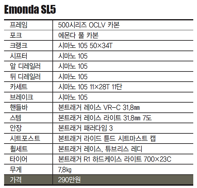 요즘은 제조사의 홈페이지나 웹 서핑을 통해 완성차 사양을 누구나 쉽게 보고 비교할 수 있다. 하지만 눈으로만 쉽게 비교할 수 있는 구동계만 가지고 완성차 전체의 성능을 단정짓는 것은 무리다. 적어도 에몬다 SL5를 본다면 말이다. 이미 당장이라도 레이스에 나갈 수 있는 충분한 성능과 편안한 퍼포먼스를 동시에 갖춘 에몬다 SL5에 대한 평가는 바로 부품이 아닌 프레임에 집약된 트렉의 기술력에서 충분히 발휘되기 때문이다.”