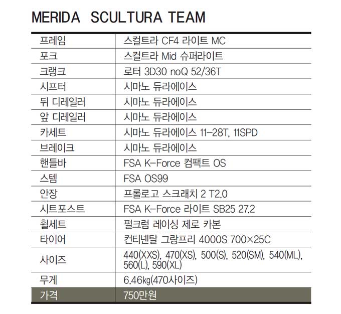 많은 부분에서 업그레이드가 이루어진 4세대 스컬트라 팀 모델은 성능 좋은 레이스타입 올라운더 로드바이크를 구매하고 싶은 유저들에게 추천할 만한 모델이다. 9000시리즈 듀라에이스 구동계를 기반으로 로터사의 3D30 noQ 크랭크, 펄크럼 레이싱 제로 카본 클린처 휠세트까지 적용된 스컬트라 팀 모델은 가격과 성능, 디자인, 스펙 모든 부분에서 만족스러운 구성의 제품이다. 이러한 점은 2016 스컬트라 팀을 소유하는 오너에게 아주 큰 만족감을 선사할 것이다. 750만원이라는 가격대는 여태껏 메리다 모델 특유의 장점을 가지고 있었던 ‘가격대비 가치’라는 측면에서도 그 성격을 그대로 유지하고 있다고 할 수 있다.