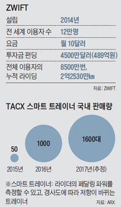 [세계는 지금 실내 가상 자전거 붐] 가상화면이 페달링따라 속도 내… 온라인 연결돼 전세계인과 경쟁도 국내선 BEC·사이클존 등 생겨 해외에선 한국계 미국인이 만든 '즈위프트'가 이용자 12만명 확보 전용 소프트웨어·앱 등장 잇따라